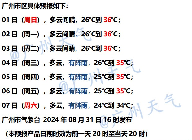 2日-4日广州天气炎热,个别地方有几阵雷雨,间中雨势较大。展望5日-6日受海面辐合带影响,雷雨趋活跃,雨势加大。