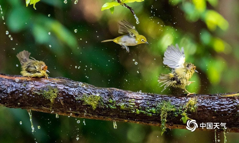 8月30日,广西南宁天气闷热难耐,在良凤江国家森林公园,不同种类的几只小鸟来到一处人工水槽清理羽毛、消暑降温。图/中国天气网