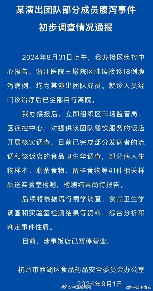 该通报称,8月31日上午,浙江医院三墩院区陆续接诊18例腹泻病例,目前已完成部分发病者的流调和该饭店的食品卫生学调查,涉事饭店已暂停营业。