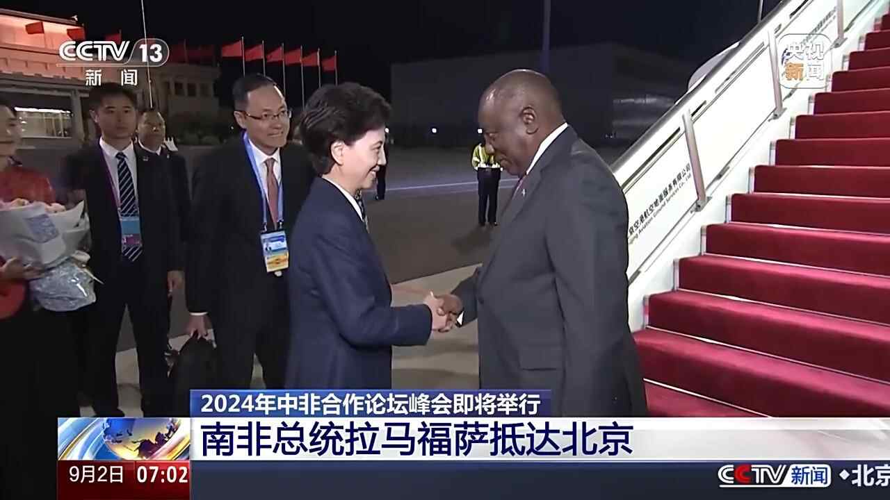 9月2日凌晨3点10分,南非总统拉马福萨乘机抵达北京,将出席在北京举行的2024年中非合作论坛峰会。
