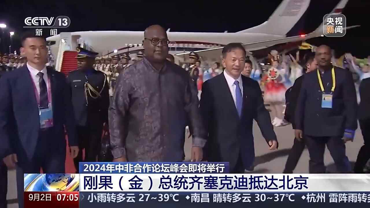 9月1日晚10点35分,刚果(金)总统齐塞克迪乘机抵达北京,他将出席2024年中非合作论坛峰会。