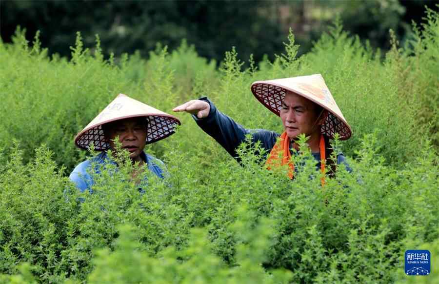 在广西仙草堂制药有限责任公司基地,工人在查看青蒿生长情况(8月28日摄)。新华社记者 黄孝邦 摄