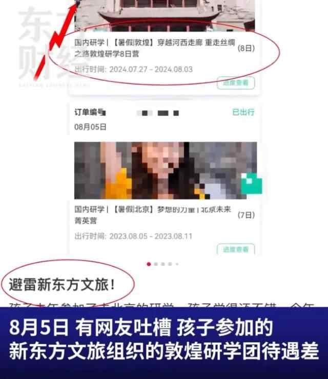 此外,据《东方财经》微博消息,8月5日,有网友爆料新东方文旅组织的敦煌研学团待遇差:8天7夜的团,上万元的团费,还不包括往返的交通费用,但是被孩子抱怨行程累,酒店差,收缴通讯设备,“有个孩子睡着了,却被营长拍醒”。