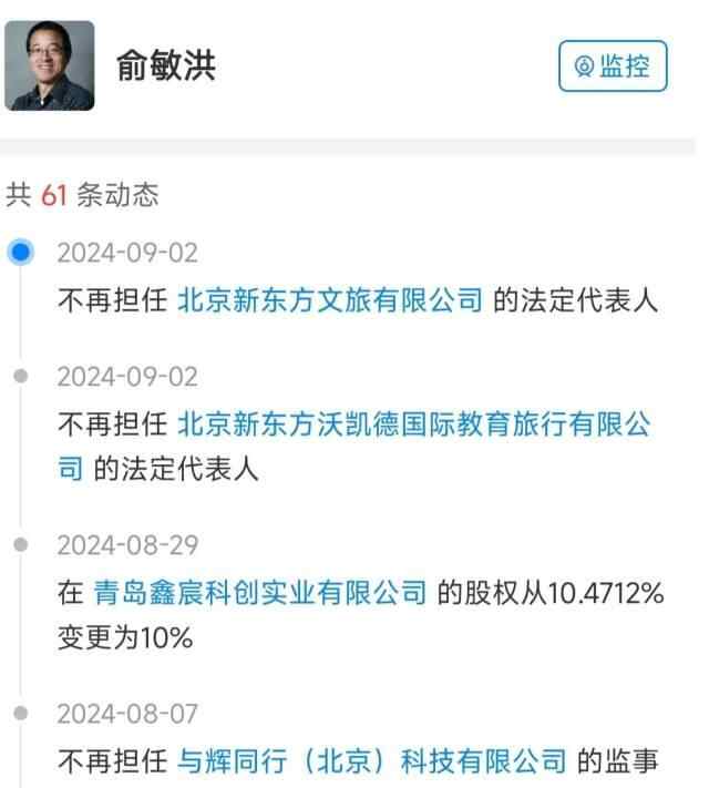 9月2日,天眼查官网显示,北京新东方文旅有限公司及其全资子公司北京新东方沃凯德国际教育旅行有限公司均发生工商变更,俞敏洪卸任两公司法定代表人,由杨志辉接任。但这两家公司的董事长仍均为俞敏洪。