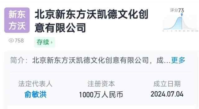 今年7月4日,新东方成立北京新东方沃凯德文化创意有限公司布局文创产业,该公司为北京新东方沃凯德国际教育旅行有限公司的全资子公司,法定代表人、董事长为俞敏洪。