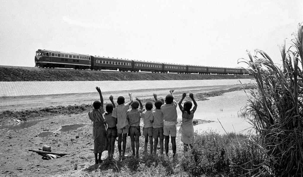 赞比亚鲁西瓦西湖畔的少年儿童欢迎坦赞铁路的列车通到他们的家乡(1976年摄)。