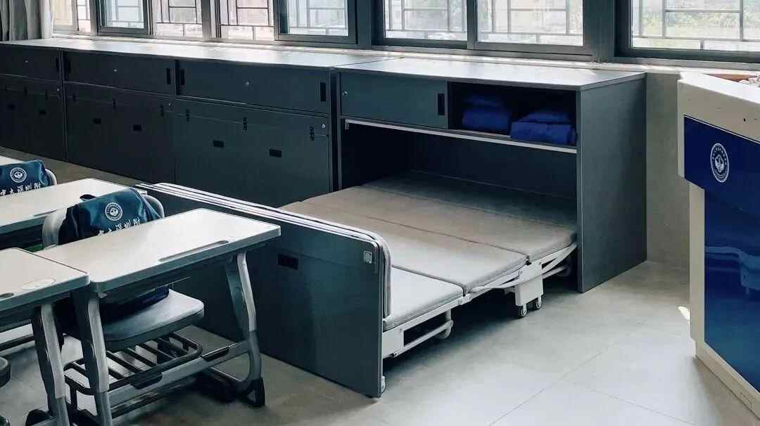 在中山大学深圳附属学校,全校79个班级全部配备了隐藏式午休床,学生们都能够躺在床上午休。