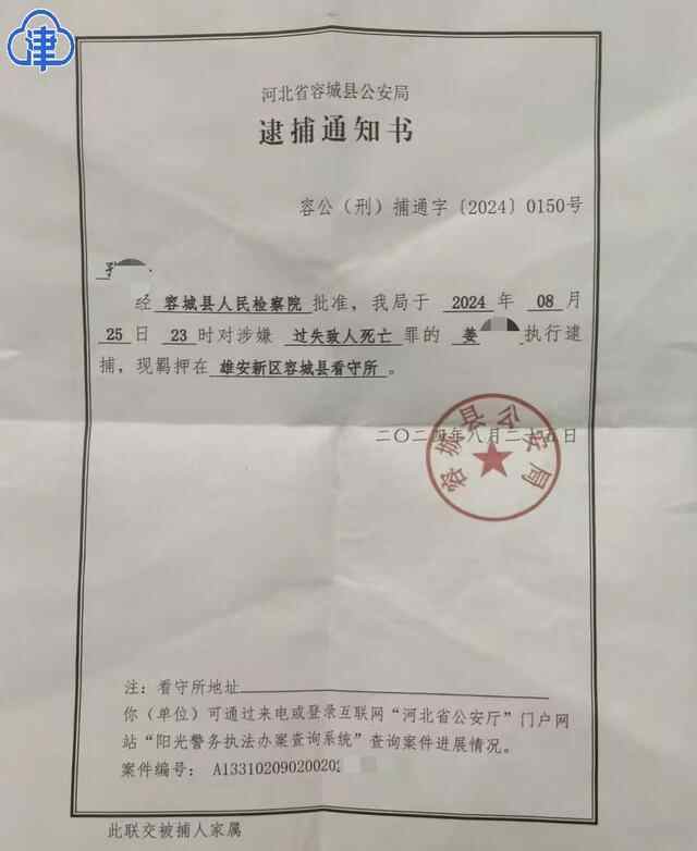 8月25日,家属收到了姜某被逮捕通知书,该通知书显示,经容城县人民检察院批准,对涉嫌过失致人死亡罪的姜某执行逮捕,现羁押在雄安新区容城县看守所。