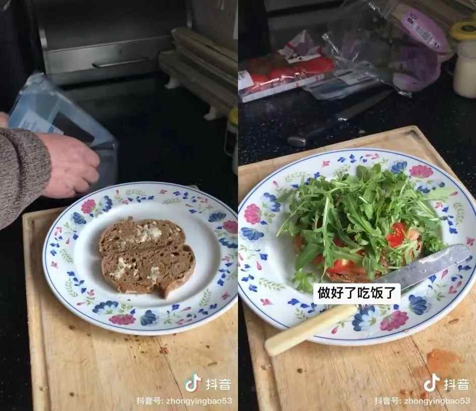 视频中一位英国大叔用餐刀咔呲咔呲、边切边磨费力切下两片硬邦邦的面包片,然后用餐刀颤巍巍刮出黄油,抹在面包上,盖上牛油果、培根、几根菜叶,塞进嘴里,费劲儿咬下,用力咀嚼。