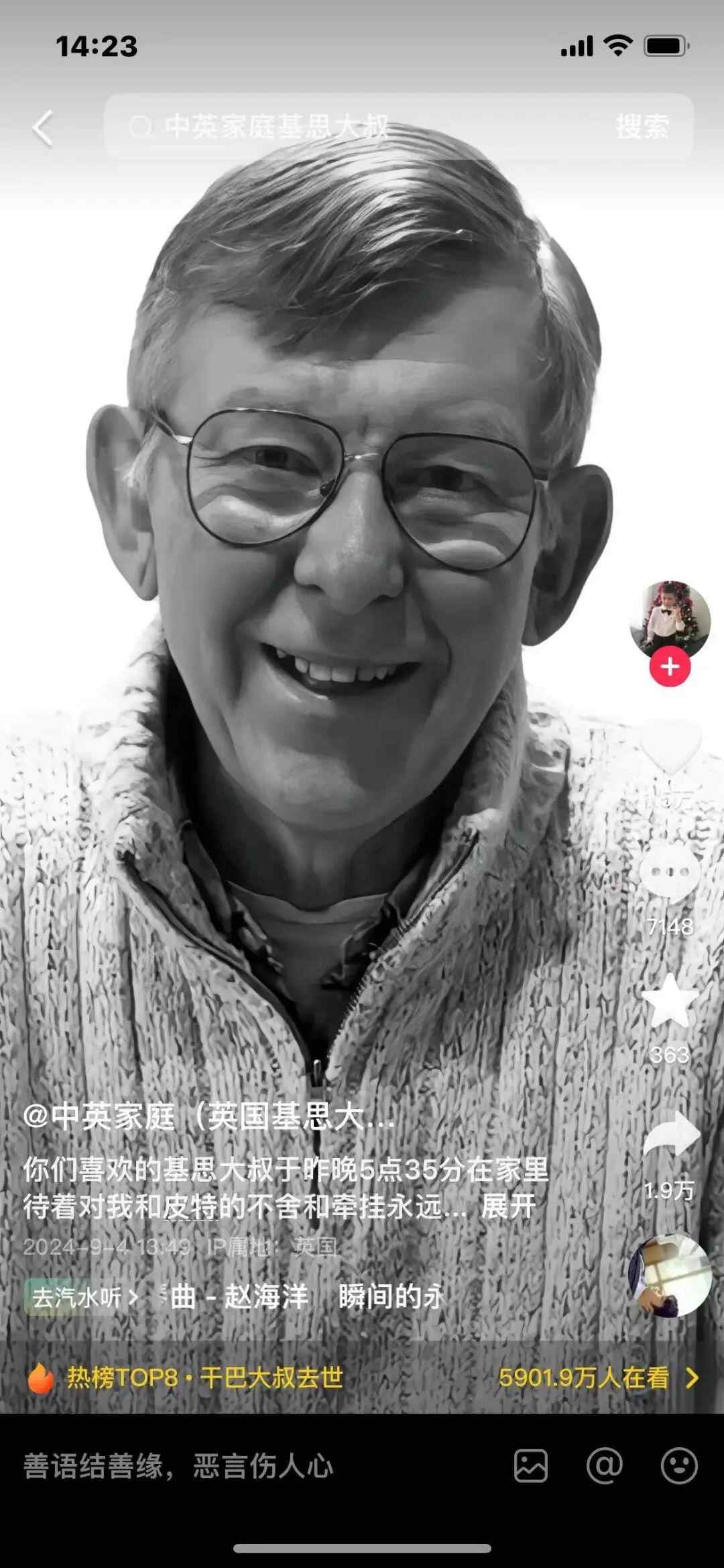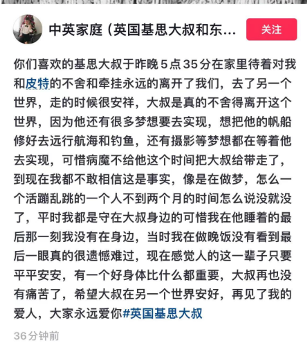 8月27日晚,账号“中英家庭(英国干巴基思大叔和东北大姨)”在直播中透露,网红“干巴大叔”查出骨癌,正在接受治疗。