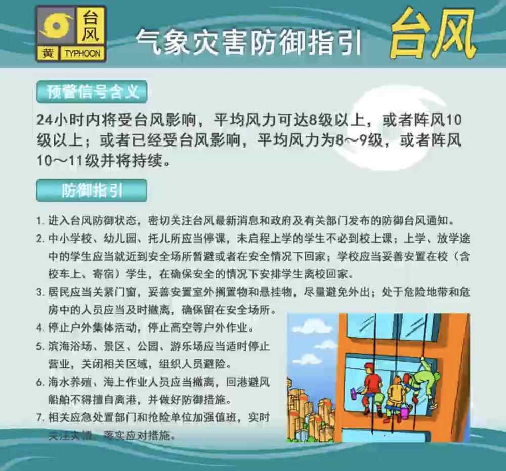按照广东省对台风黄色预警信号的防御指引,发布信号的地区24小时内将受台风影响,平均风力可达8级以上,或者阵风10级以上;或者已经受台风影响,平均风力为8~9级,或者阵风10~11级并将持续。当地将进入台风防御状态,市民和有关职能部门需密切关注台风最新消息和政府及有关部门发布的防御台风通知。
