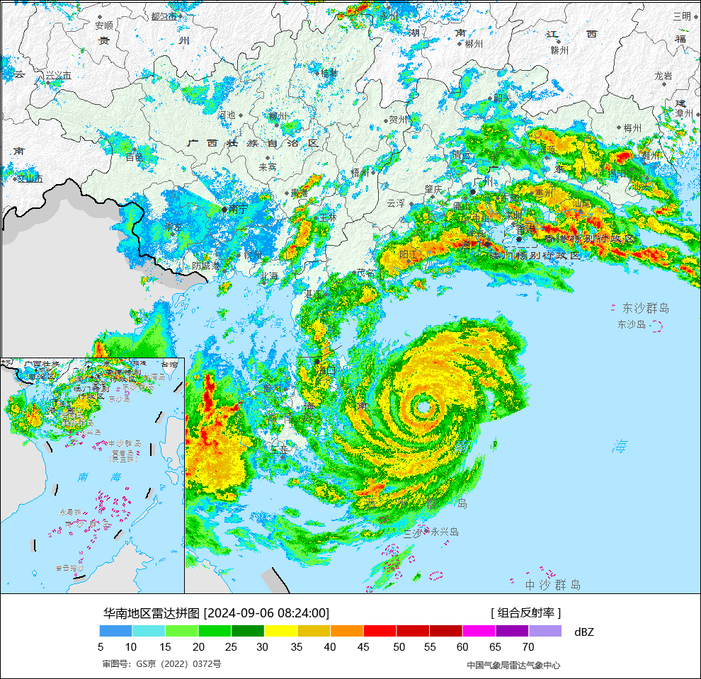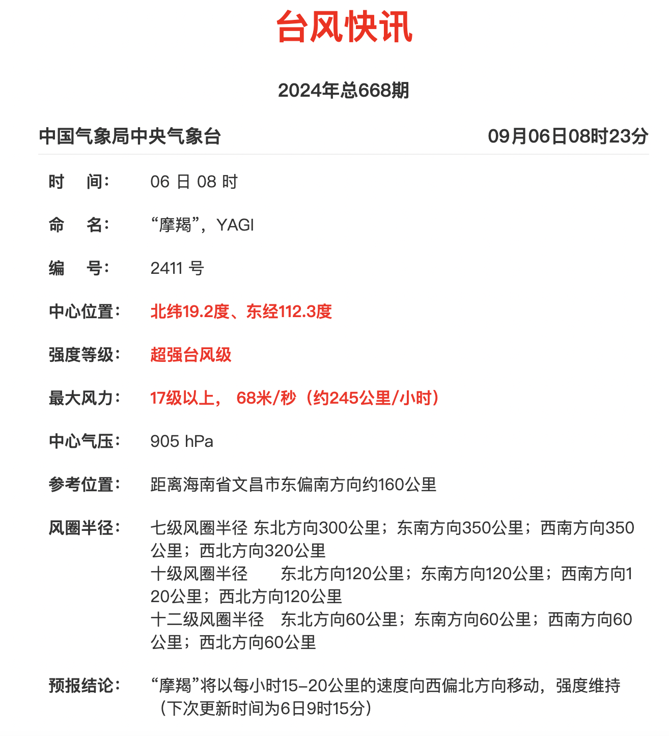 中央气象台观测,“摩羯”中心9月6日8时距离海南省文昌市东偏南方向约160公里(北纬19.2度、东经112.3度),继续保持着超强台风级强度,中心附近最大风力17级以上(68米/秒,约245公里/小时),成为今年西北太平洋和南海上的“风王”。