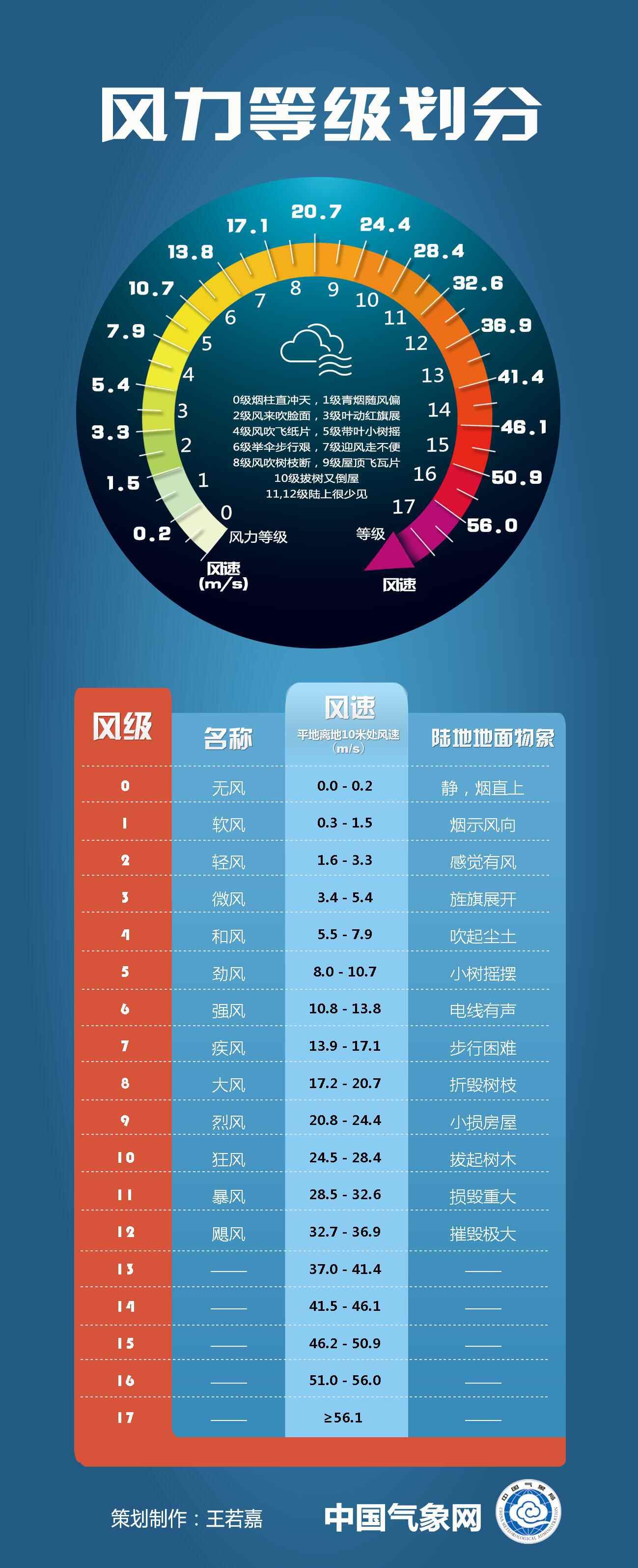 为方便台风业务和服务,中国气象局制定了《台风业务和服务规定》,按照蒲福风力等级制定风力等级划分。为方便对中心附近最大风力12级以上的台风实施各项业务,《台风业务和服务规定》中的风力等级划分表,在常规0级到12级的风力划分基础上进一步延伸至17级,其中17级风力的范围为56.1-61.2米/秒。由于“摩羯”的风力自9月5日23时已经超过了17级风力范围,且风力等级划分表当中17级已是最大风力,所以中央气象台截至9月6日早晨有关“摩羯”的中心附近风力发布,均标注为“17级以上”。