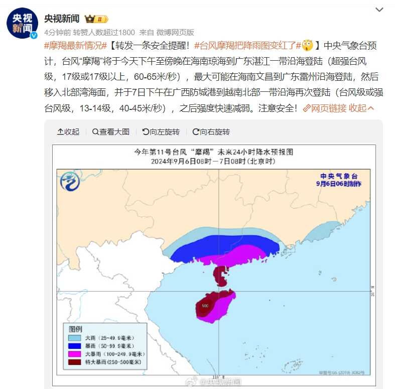 预计,“摩羯”将于6日下午至夜间在海南琼海到广东电白一带沿海登陆(超强台风级,16-17级,52-58米/秒),最大可能在海南文昌到广东湛江沿海登陆。