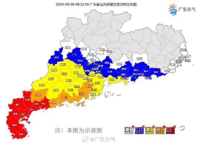 截至9月6日6时12分,湛江、茂名共9个市县挂着台风红色预警信号;高州、阳西、阳江、台山、新会5个市县挂着台风橙色预警信号;另外,信宜、云浮、江门、肇庆、顺德、南沙、中山、珠海、深圳等20个市县挂着台风黄色预警信号。