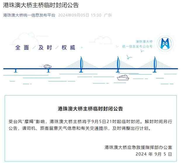 受台风“摩羯”影响,为确保交通安全,经三地会商,港珠澳大桥应急救援指挥部定于9月5日21时00分起,对港珠澳大桥主桥实施临时封闭,解封时间另行公告。