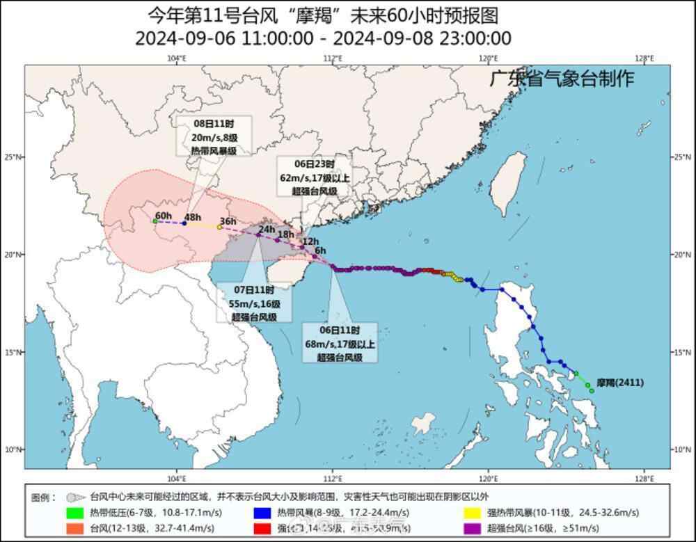 9月6日余下时间,粤西市县风力9~12级,阵风13~14级,其中“摩羯”中心经过的附近区域旋转风15~17级,珠江三角洲中南部市县风力6~9级,阵风10级级,粤东沿海市县风力5~7级。