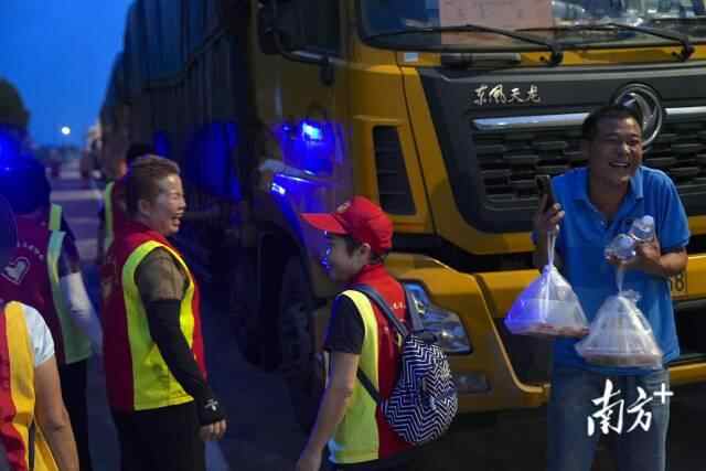 与此同时,共青团徐闻县委组织70余名志愿者,与公安干警和交警队伍联合开展餐食和物资派送,鲜红的旗帜和背心缓缓在货车之间穿梭,许多货车司机纷纷下车领取热腾腾的饭菜,脸上露出了笑意。“政府给我们派送物资来了,你要不要也过来领取一下?”司机们在电话中口耳相传,道路上渐渐热闹了起来。