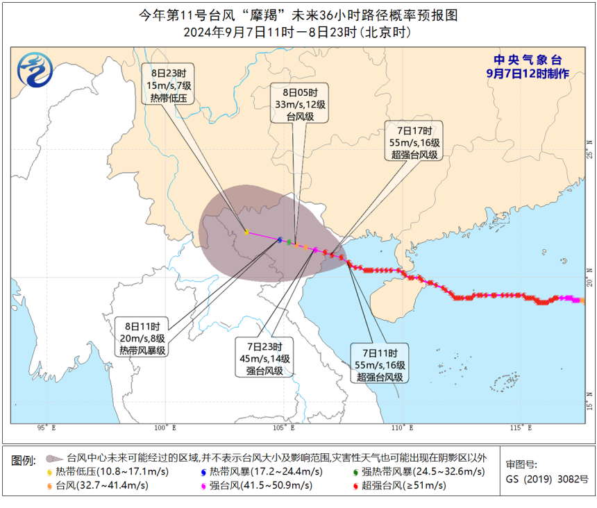 根据中央气象台观测,9月7日13时“摩羯”中心风力再次加强,不仅继续维持着超强台风级别,且中心附近最大风力重新提升至17级(60米/秒,约216公里/小时)。当天13时,其中心距离越南广宁省下龙市东南方向约45公里(北纬20.7度、东经107.4度)。预计“摩羯”将于9月7日下午至夜间在越南东北部至中越交界一带沿海登陆,登陆后将继续西行,强度逐渐减弱。