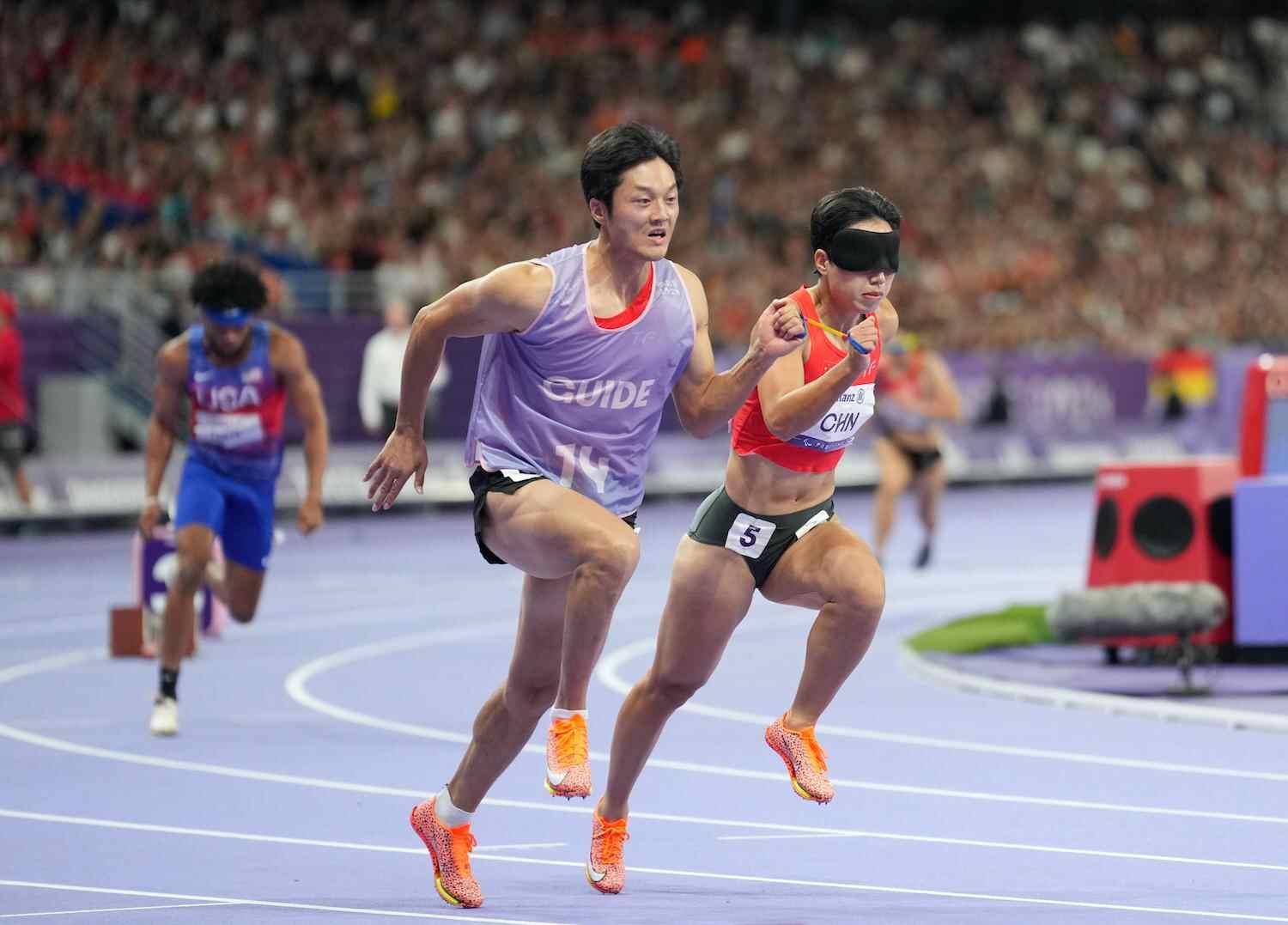 这份呵护和这份信任,也让周国华挣脱了黑暗,勇敢奔跑。在一次次训练和磨合中,两人的配合愈发默契。在奔跑中,贾登璞就是周国华的“眼睛”,一根10厘米的牵引绳紧紧连接着彼此,共同向终点冲刺。周国华也不负努力,多次在国际赛场摘金夺银。本届残奥会,她再一次站上了最高领奖台。