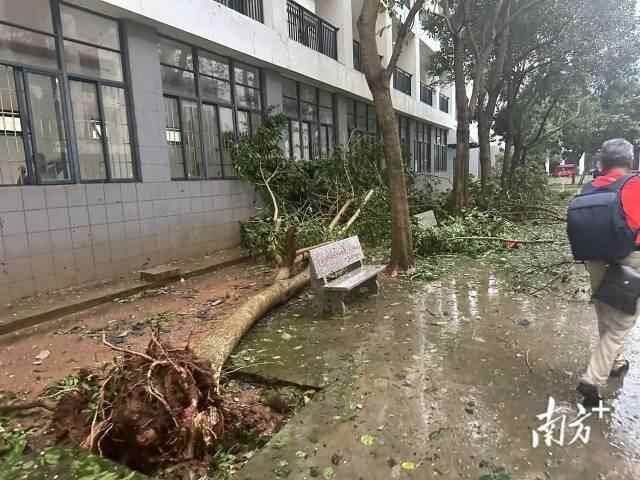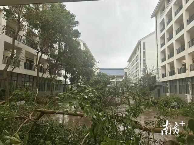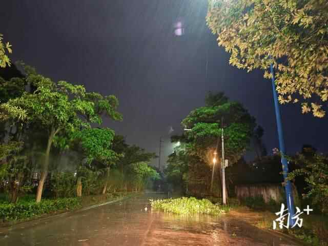 9月6日19:30,记者在湛江市区看到,马路上已有树木倒下,掉落的花瓣铺满路面。