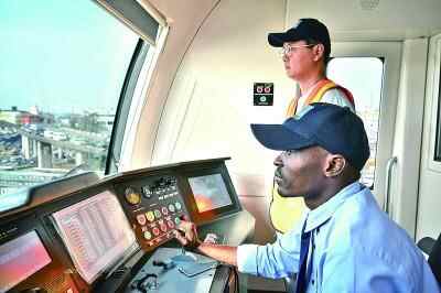 尼日利亚拉各斯,中国师傅指导当地见习司机驾驶中企承建的轻轨列车。新华社发
