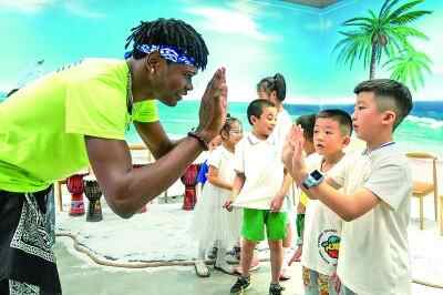 在位于湖南高桥大市场的中非经贸博览会常设展馆安哥拉馆,志愿者和学生在研学过程中击掌。新华社发