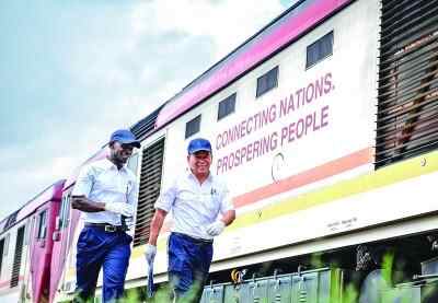 肯尼亚内罗毕,中国火车驾驶员与当地学员从蒙内铁路机车旁走过。新华社发