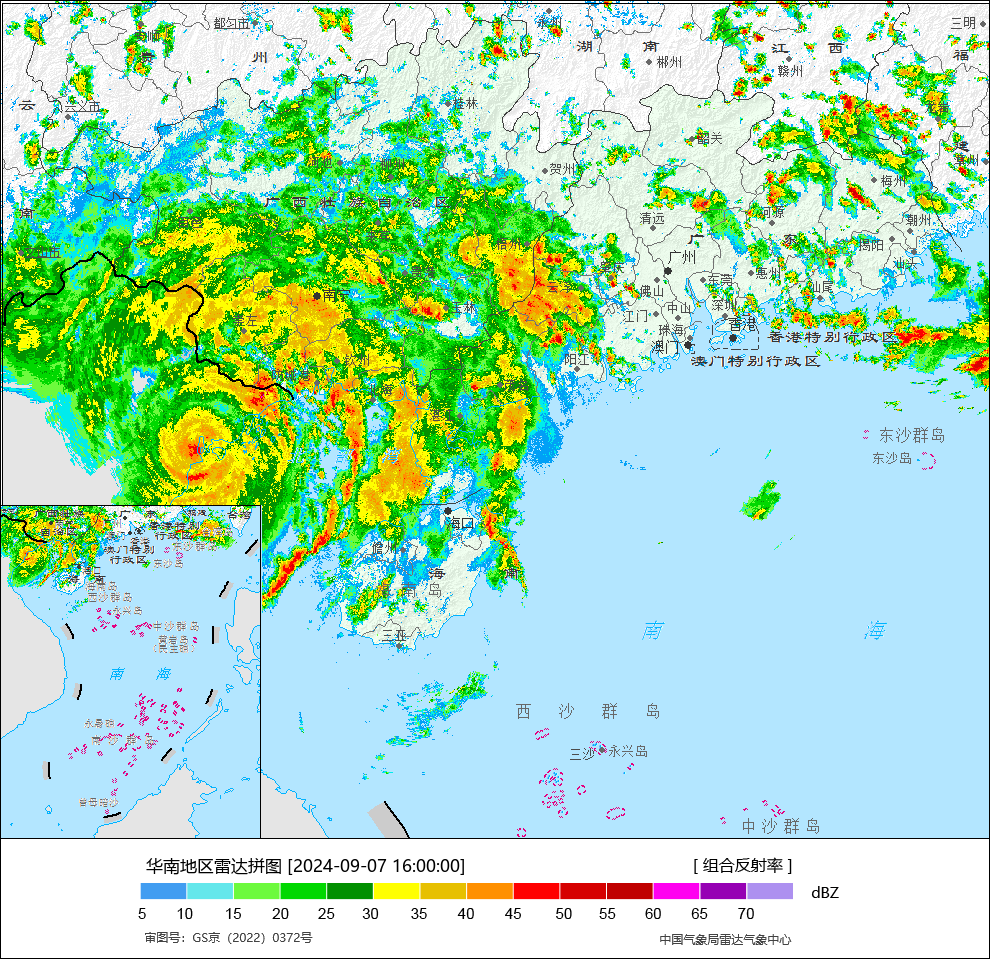 今天下午,“摩羯”东侧和北侧形成多条螺旋雨带,继续影响华南地区。
