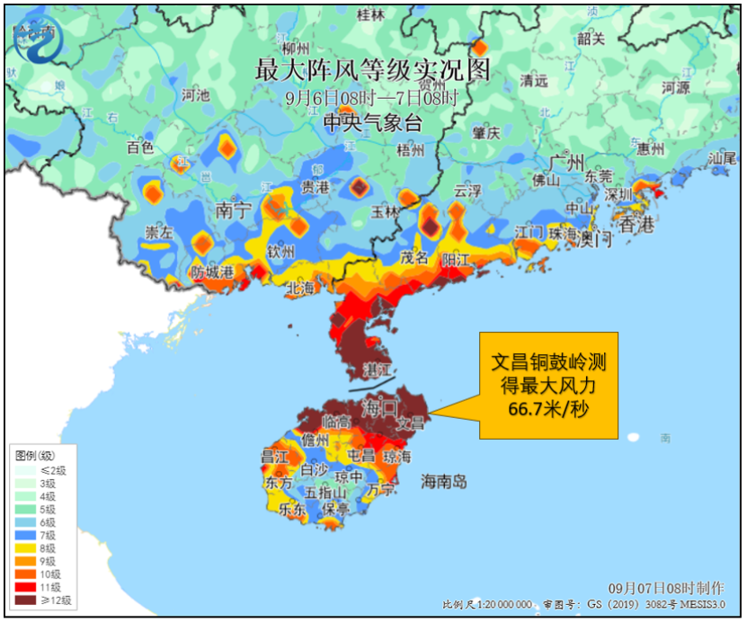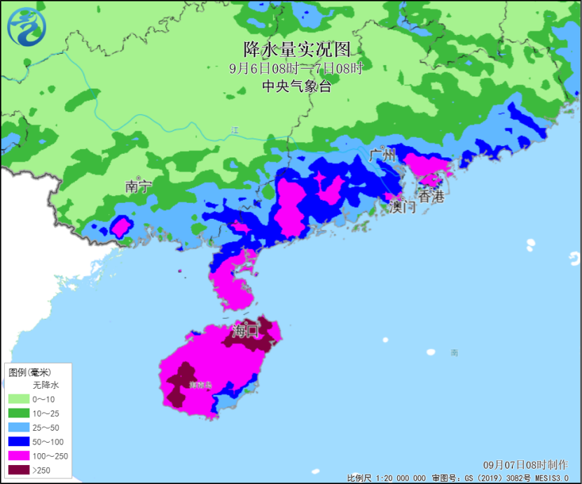 昨天8时至今天8时,海南澄迈、海口及广东湛江等局地风力达15~17级,海南文昌铜鼓岭观测到最大风力17级以上(66.7米/秒),海口观测到了14级阵风(41.9米/秒),也是相当罕见;此外,海南岛、广东西南部和沿海、台湾岛南部等地部分地区和广西东南部局地出现暴雨或大暴雨,海南海口、文昌、定安、昌江、乐东等局地特大暴雨,文昌单日雨量打破当地9月单日降雨纪录。