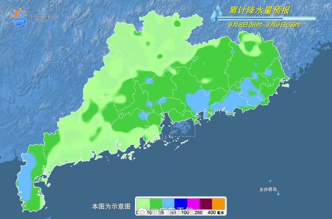 今天(8日),广东南部市县有中雨局部暴雨,其余市县有(雷)阵雨。