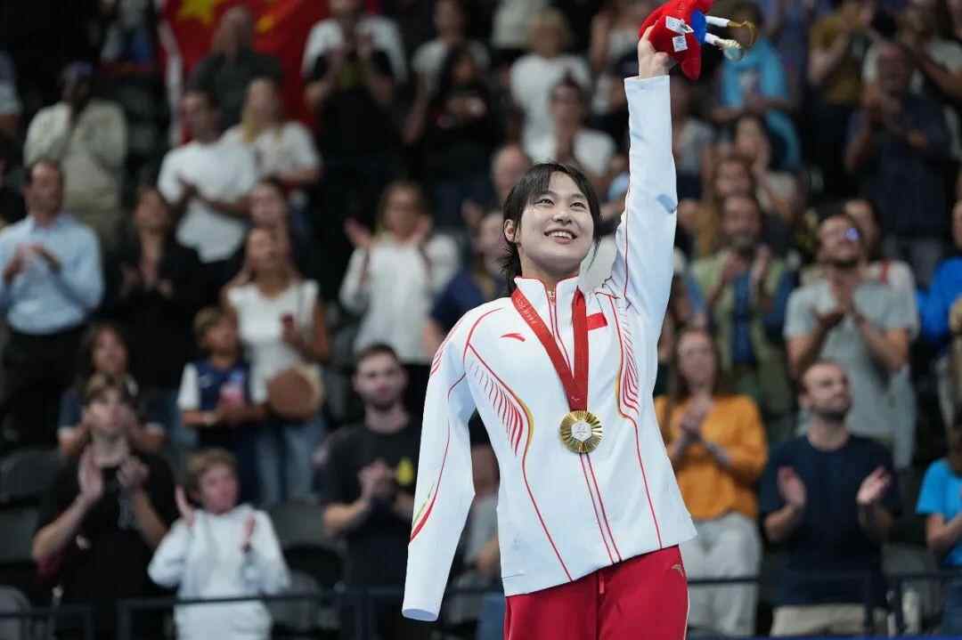 9月4日,蒋裕燕在颁奖仪式上向观众致意。在巴黎残奥会游泳女子100米自由泳S7级决赛中,中国选手蒋裕燕以1分09秒68的成绩打破世界纪录获得冠军