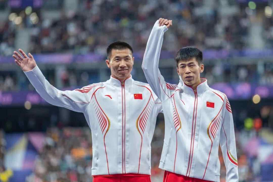 9月5日,季军中国选手邸东东(右)与领跑员廉佳庚在颁奖仪式上。在巴黎残奥会田径男子100米T11级决赛中,中国选手邸东东以11秒08的成绩获得铜牌。