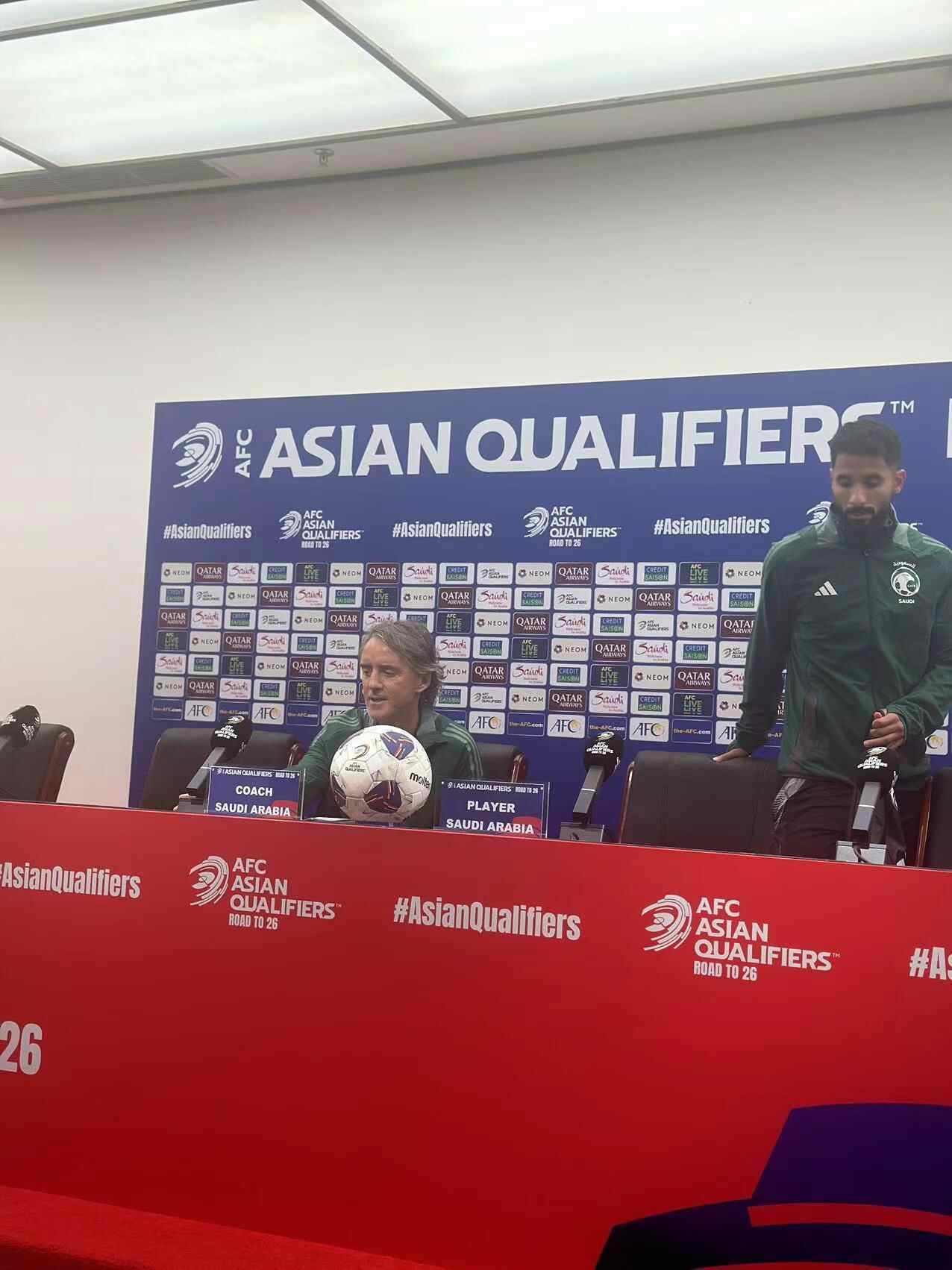 北京时间9月10日晚间8点,国足将迎来世预赛18强赛首个主场和沙特的比赛,9日傍晚,沙特队主教练曼奇尼和球员萨利赫·谢赫里参加赛前发布会。