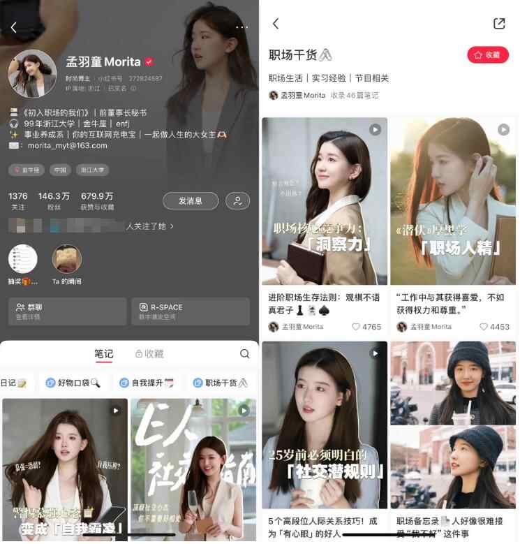 从格力离职后,孟羽童转战自媒体,自我定位从“前500强董事长秘书”转为“事业养成系大女主”,以年纪轻轻就扭转舆论、掌握人生主动权的姿态吸引年轻人关注。其分享内容主要可以归纳为“职场干货”“自我提升”“大女主如何养成”等几个门类。