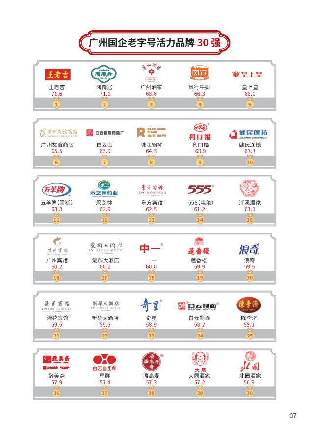 广州老字号以市属国企为大本营,截至目前,广州市属国企共有中华、省、市各级老字号85个,占全市比重过半;其中中华老字号32个,分别占全市的89%和全省的44%。相较2022年,新增珠江钢琴、双鱼、利口福3个中华老字号,新增白云山、五羊牌广州2个老字号。
