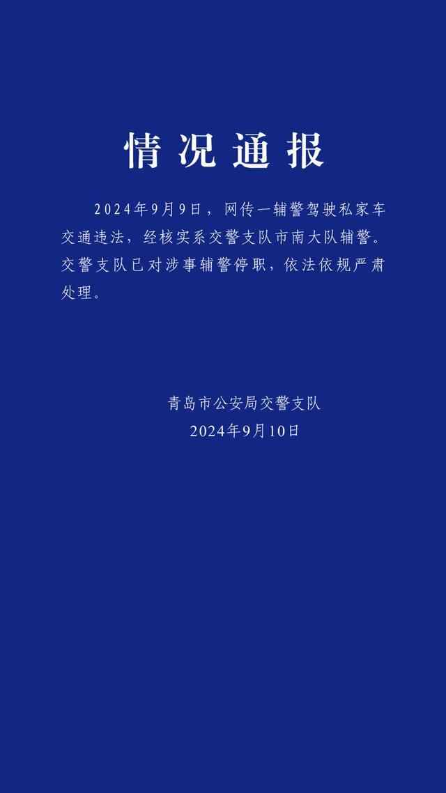 近日,有网友发布视频称,山东青岛一辅警未系安全带开私家车逆行,引发关注。针对此事,9月10日,青岛市公安局交警支队发布情况通报:9月9日,网传一辅警驾驶私家车交通违法,经核实系交警支队市南大队辅警。交警支队已对涉事辅警停职,依法依规严肃处理。