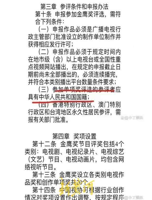 据公开资料显示,金鹰奖评选规定之一,要求参评者必须具备中国国籍,港澳台地区参评者需要有关部门批准。违法失德艺人和其参演的作品都不得参与评选。 而刘亦菲是美国国籍,不符合金鹰奖的入围要求。在其二轮入围后,遭到网友质疑,于是官方删除了刘亦菲入围资格。