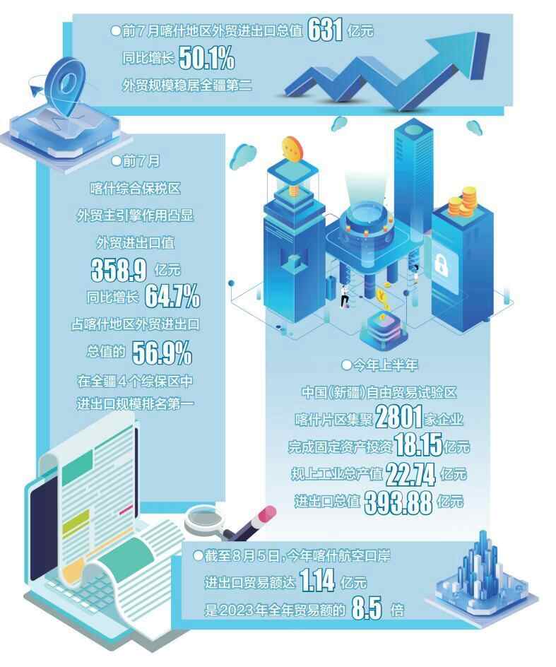 前7月,喀什地区外贸进出口总值631亿元、同比增长50.1%,外贸规模稳居全疆第二;喀什综合保税区外贸主引擎作用凸显,外贸进出口值358.9亿元、同比增长64.7%,占喀什地区外贸进出口总值的56.9%,在全疆4个综保区中,进出口规模排名第一……