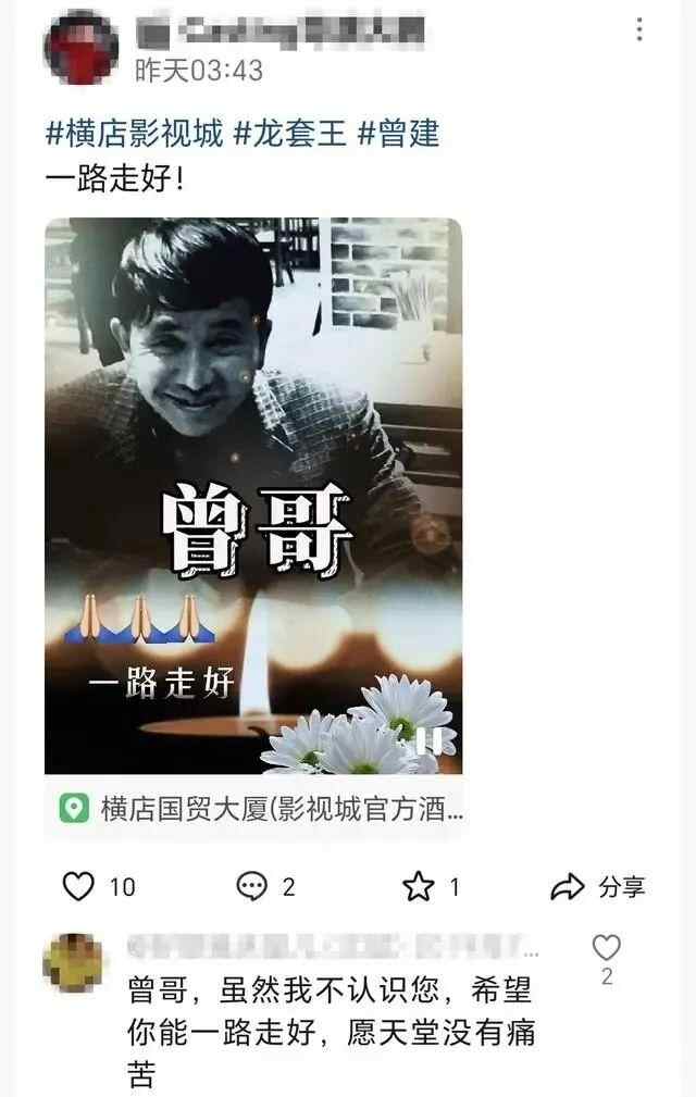 近日,不少“横漂”发视频悼念称,曾建在位于横店镇的租住处去世。9月10日,多名自称是曾建生前好友的人告诉记者,曾建生前是独居,在8月底去世,去世前没有家人陪伴。他们称,在曾建去世几天后才得知这一噩耗,不清楚其去世的原因,不过曾建生前患有疾病,或许是因病去世。