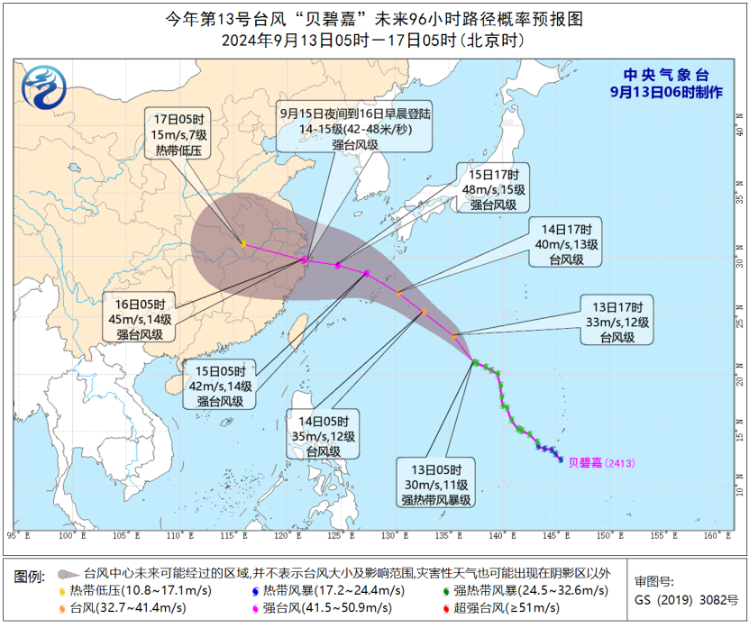 预计,“贝碧嘉”将以每小时25公里左右的速度向西北方向移动,强度逐渐增强,14日夜间穿过琉球群岛移入东海东部海面,之后向浙闽沿海靠近,并将于15日夜间至16日早晨在上海到福建北部一带沿海登陆(强台风级,14-15级,42-48米/秒),之后强度逐渐减弱。