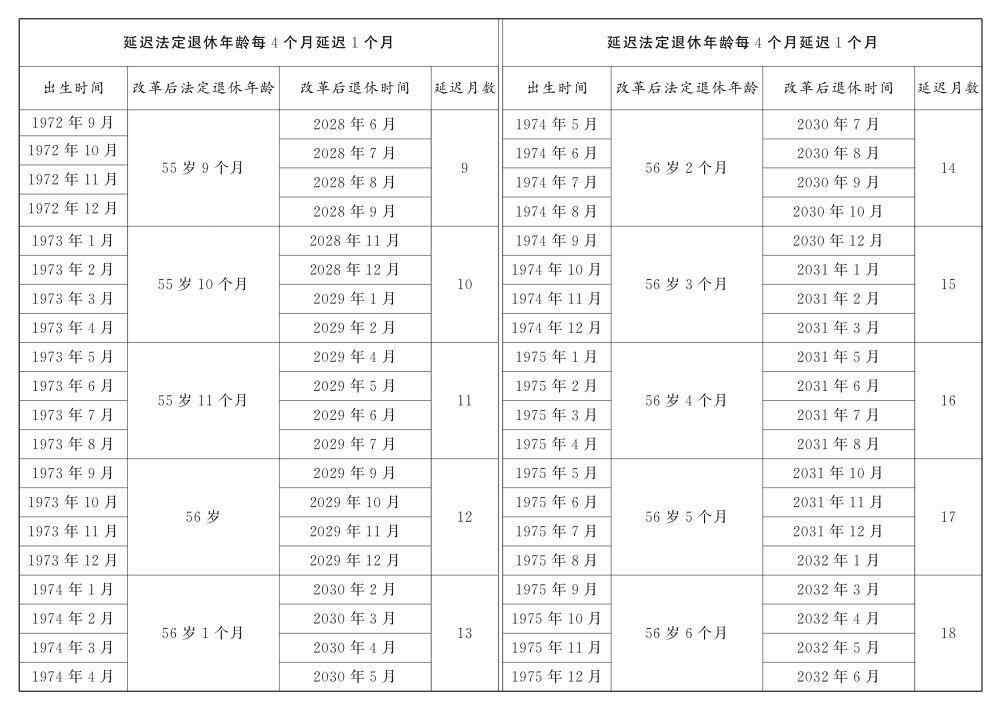 第一条 从2025年1月1日起,男职工和原法定退休年龄为五十五周岁的女职工,法定退休年龄每四个月延迟一个月,分别逐步延迟至六十三周岁和五十八周岁;原法定退休年龄为五十周岁的女职工,法定退休年龄每二个月延迟一个月,逐步延迟至五十五周岁。国家另有规定的,从其规定。