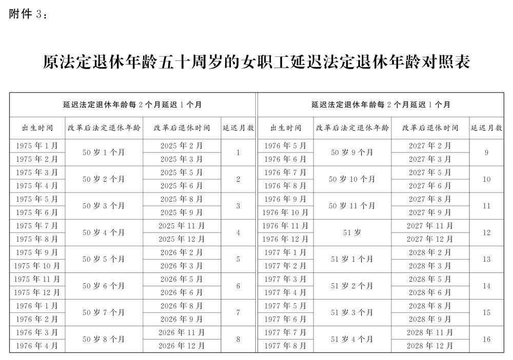 3.原法定退休年龄五十周岁的女职工延迟法定退休年龄对照表