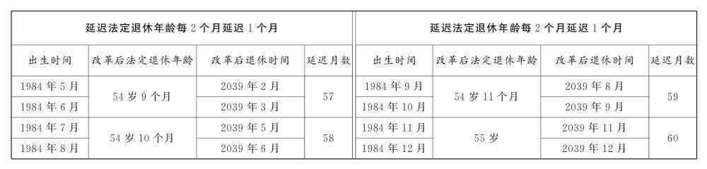 一、同步启动延迟男、女职工的法定退休年龄,用十五年时间,逐步将男职工的法定退休年龄从原六十周岁延迟至六十三周岁,将女职工的法定退休年龄从原五十周岁、五十五周岁分别延迟至五十五周岁、五十八周岁。