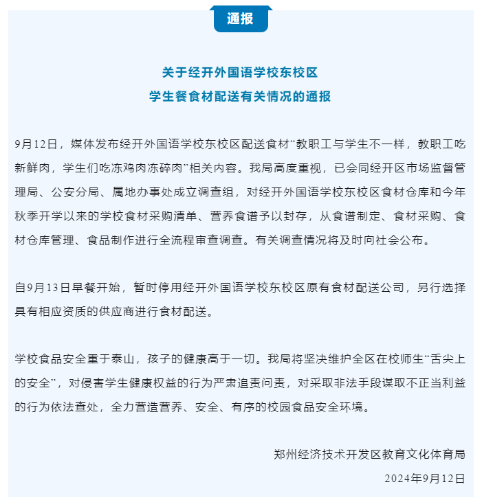 9月13日,"郑州经开发布"微信公号发布《关于经开外国语学校东校区学生餐食材配送有关情况的通报》。全文如下:
