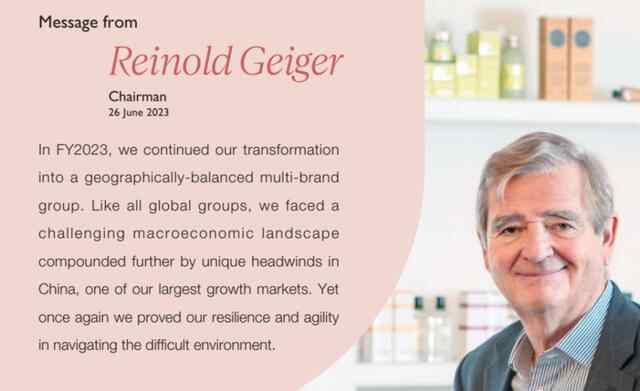 欧舒丹集团控股股东兼董事会主席雷诺德·盖格(Reinold Geiger)曾在2023年报中提到:进入新财年,我们已经看到了中国市场的积极迹象,并计划大幅增加营销投入。这将巩固品牌在中国市场回暖和国际旅游逐步恢复的基础上的发展能力,并在面部护理、身体护理和头发护理等产品类别中捕捉新的高端化趋势,我们知道在这些产品类别中,我们有权利胜出。