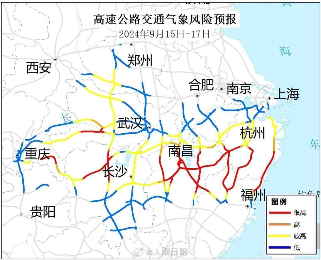 行车安全方面,预计9月15日至17日中秋假期期间,华东、华中、西南地区东部部分地区有强降水,浙江、福建、江西、湖北、湖南、重庆等地境内的京台、沈海、长深、沪昆、济广、福银、沪渝、沪蓉、大广、二广、杭瑞、包茂等高速公路局部路段交通气象风险很高,大广、沈海、杭瑞、沪蓉、包茂等高速公路部分路段交通气象灾害风险高,易出现道路积水、湿滑,同时需防范山体滑坡、道路坍塌等次生灾害。