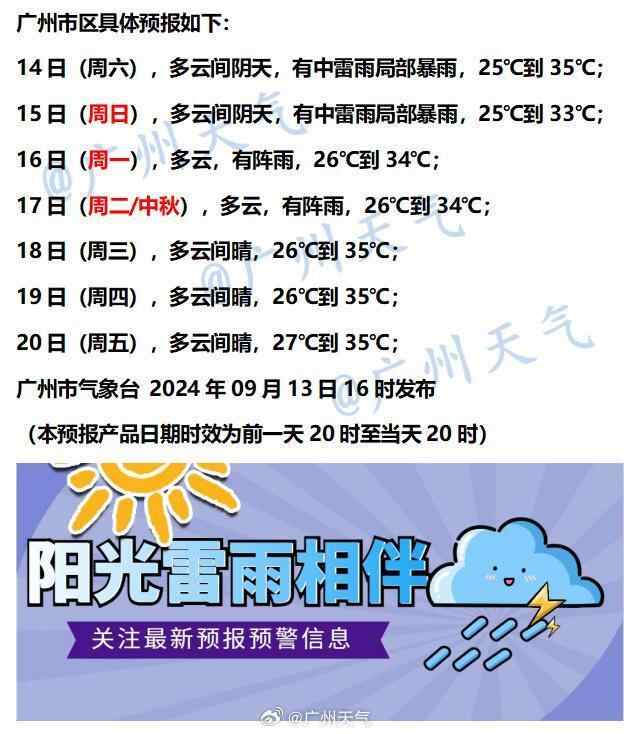 9月14日,多云间阴天,有中雷雨局部暴雨,25~35℃;