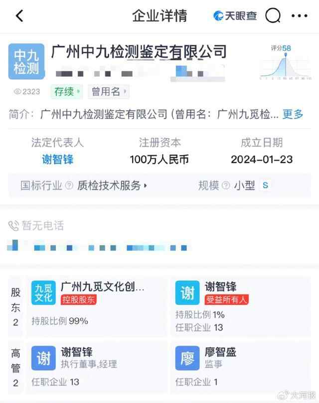 据天眼查APP,广州中九检测成立于2024年1月,其控股股东是广州九觅文化创意有限公司,这两家公司的法人均为谢智锋,前者主要业务为鉴定茅台酒,后者则主要销售茅台酒及其它优质酱香型白酒等。