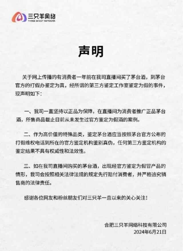对于这场真伪争议,三只羊网络也迅速做出了回应。他们发布声明称,直播间所售商品从未发生过官方鉴定为假酒的案例,任何第三方鉴定机构的鉴定结果不具有权威性和法效性。同时强调,鉴定茅台酒应当按照茅台官方公布的打假维权电话到所在的官方鉴定机构鉴别真伪。然而,这一声明却引发了更多的争议。一方面,消费者认为第三方鉴定机构的鉴定结果也具有一定的参考价值,不能完全否定;另一方面,三只羊网络将鉴定责任推给官方机构,也让消费者感到维权的难度增加。